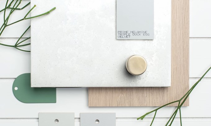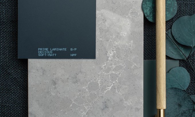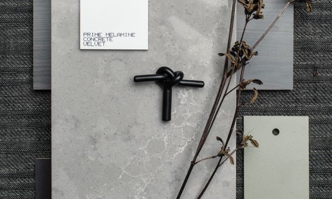 Astra is the lighter of the two new designs with a subtle white/grey base that looks beautiful paired with timber veneer or woodgrain designs. It works equally well with soft pastels such as Triple Duck Egg, Quarter Lemongrass and Grey Pearl from our Prime Melamine range.